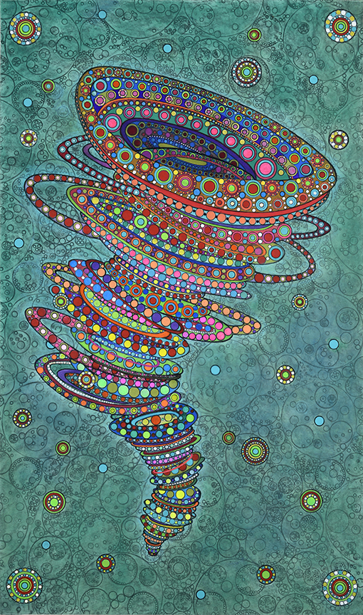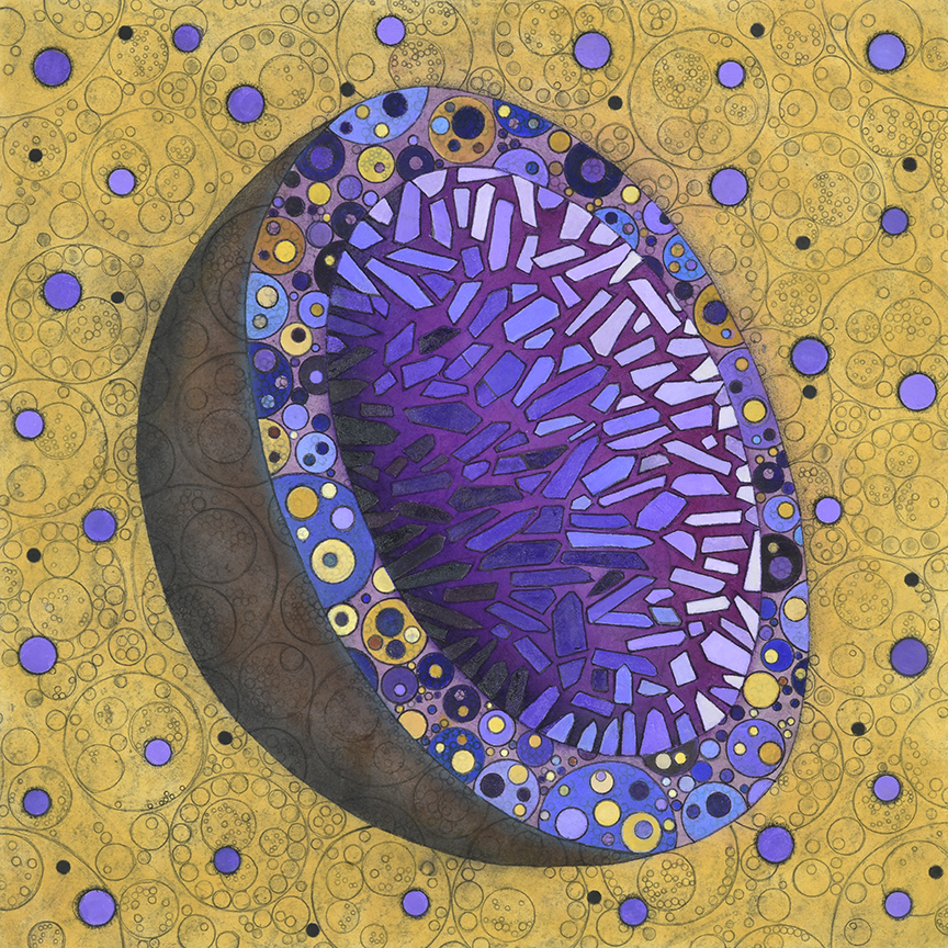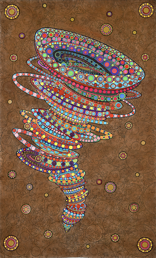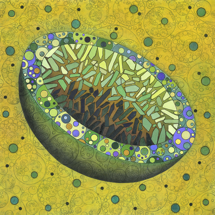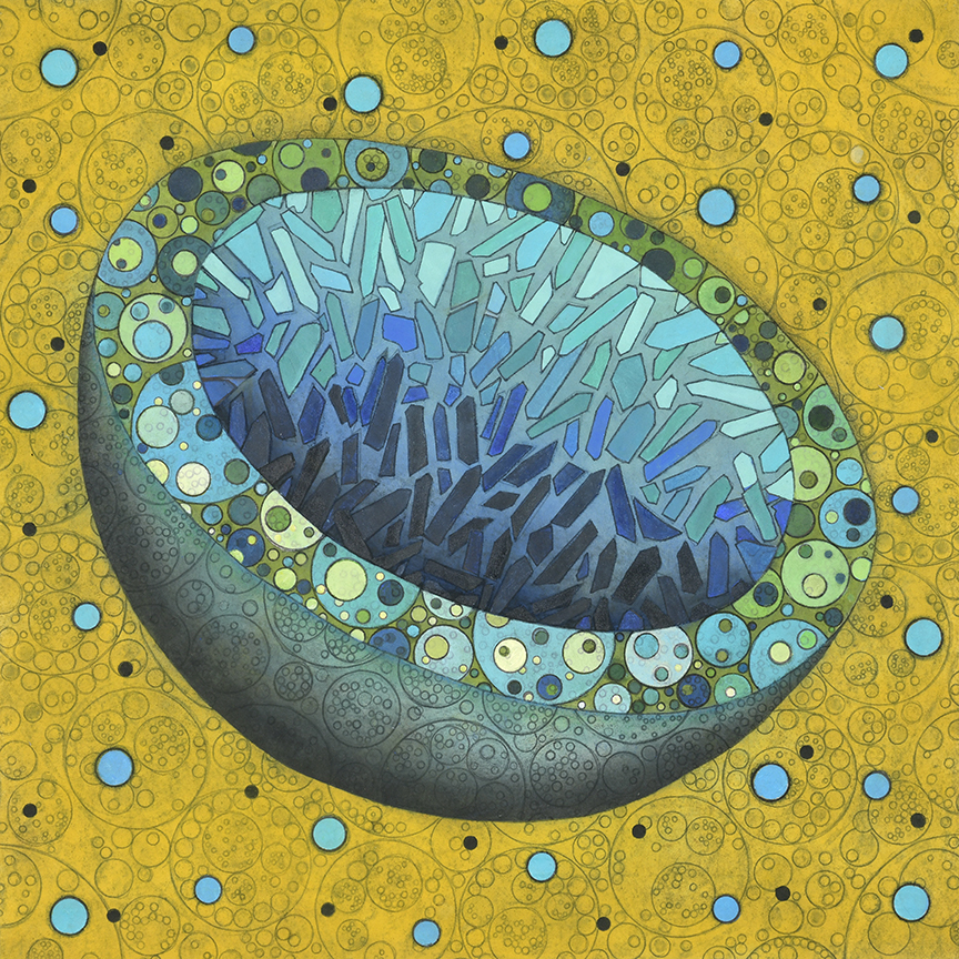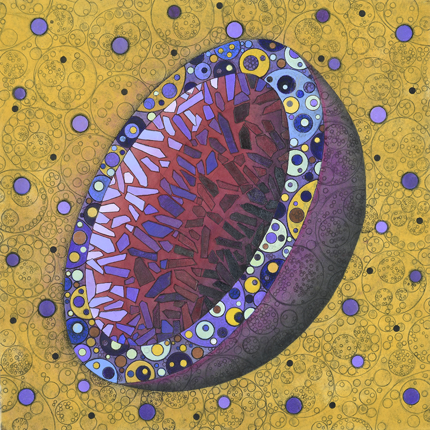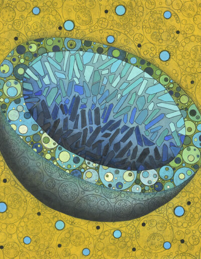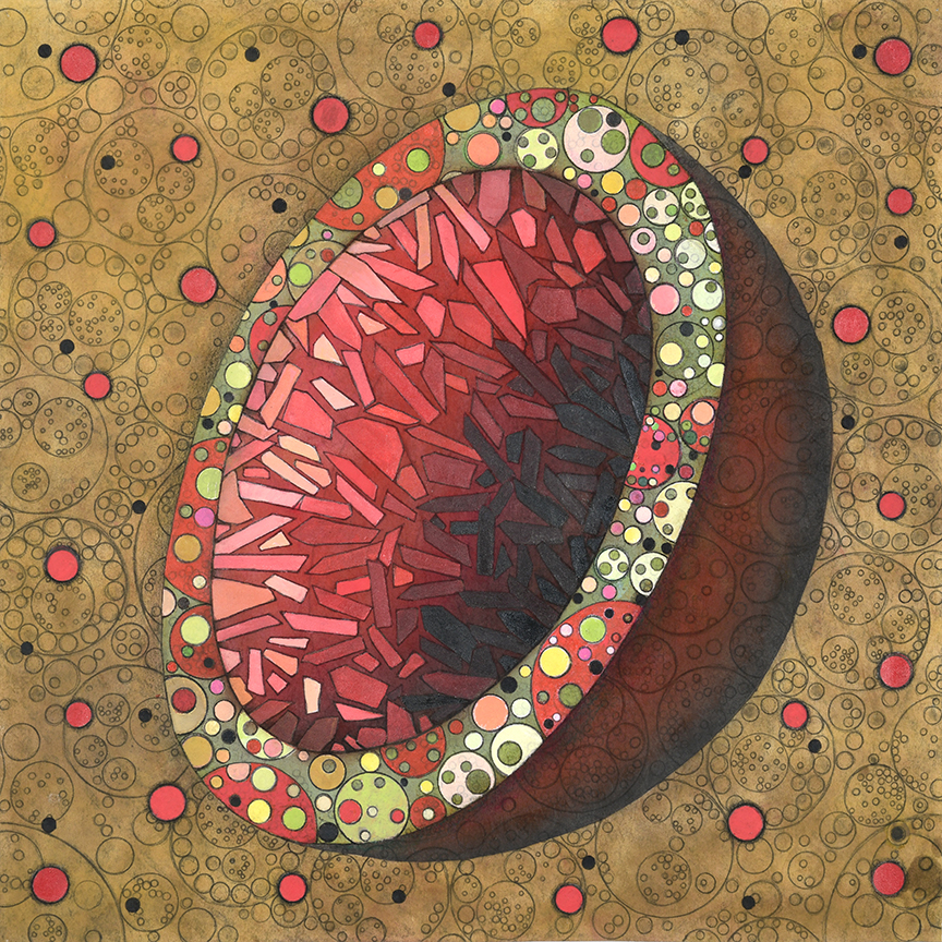 All pieces in the Drawn from Dust series of mixed media drawings were derived from one single piece. This piece, titled Dust, became the inspiration and the original source material for all the resulting drawings. Dust is constructed of shredded aerospace documents, powdered graphite and jawbreaker candy–all compacted into a round disk resembling the solar system.
